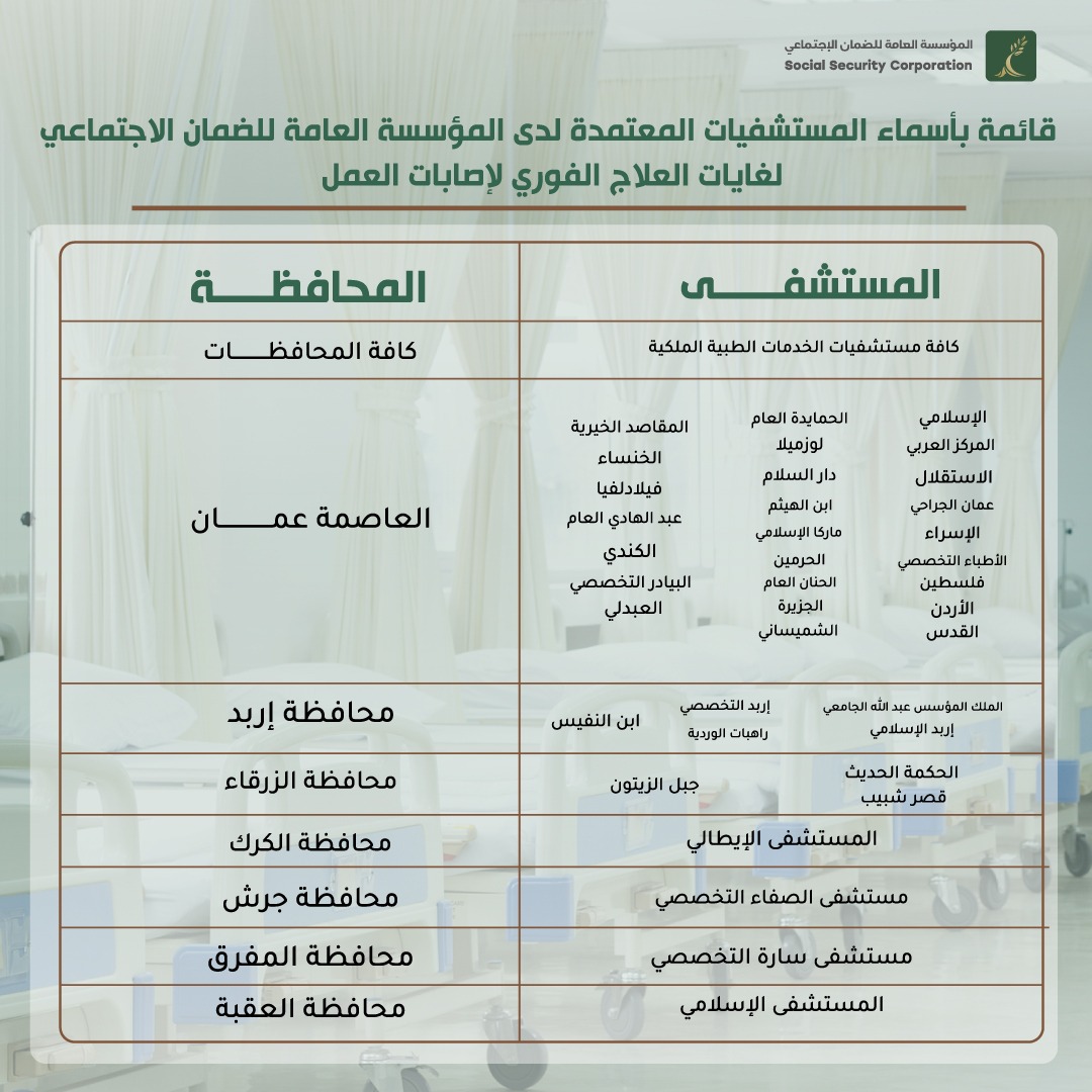 الضمان تعتمد (38) جهة طبية للعلاج الفوري لإصابات العمل