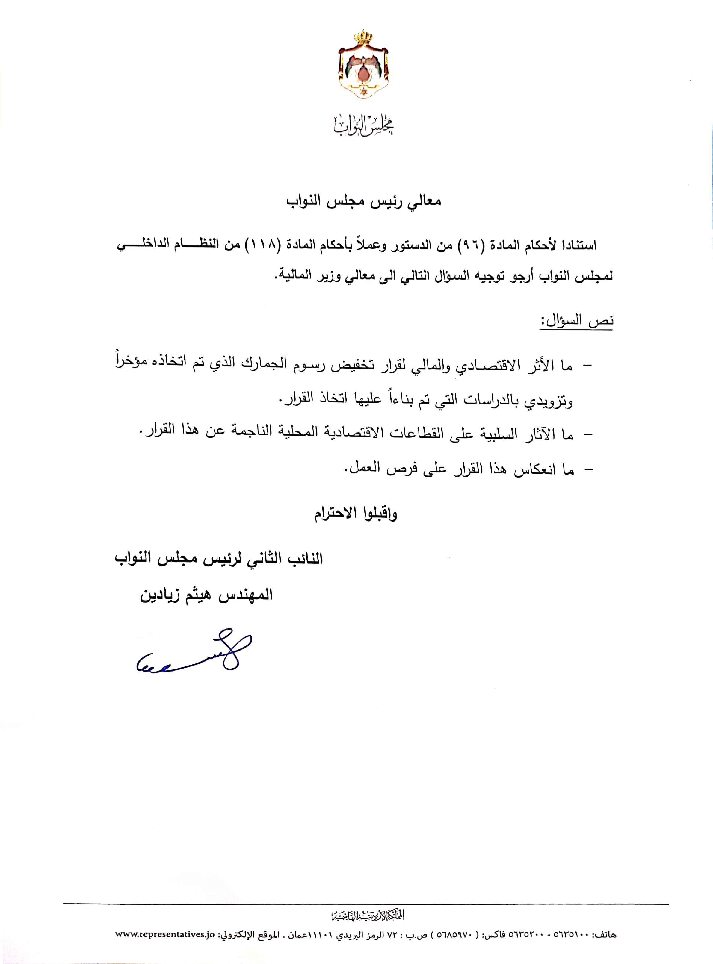 وجه النائب الثاني لرئيس مجلس النواب المهندس هيثم الزيادين سؤالا لوزير المالية د. محمد العسعس حول الأثر الاقتصادي والمالي للقرار المتخذ مؤخرا حول تخفيض الرسوم الجمركية مطالبا بتزويده بالدراسات والتي على اثرها تم اتخاذ القرار وهل لهذا القرار انعكاس إيجابي لتوفير فرص عمل ؟ وما هي الأثار السلبية على القطاعات الاقتصادية المحلية الناجمة عن هذا القرار ؟