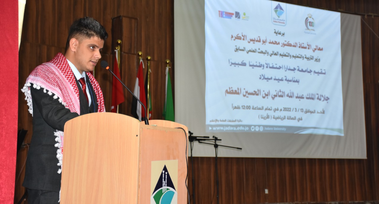 احتفلت جامعة جدارا بعيد ميلاد جلالة الملك عبدالله الثاني ابن الحسين حفظه الله تعالى والذي نظمته عمادة شؤون الطلبة برعاية وزير التربية والتعليم والتعليم العالي والبحث العلمي السابق معالي الأستاذ الدكتور محمد أبو قديس بحضور معالي رئيس الجامعة الأستاذ الدكتور محمد طالب عبيدات، وعطوفة رئيس هيئة المديرين الدكتور شكري المراشدة ومجالس الحاكمية وأسرة الجامعة ومدعوين من المجتمع المحلي والطلبة.