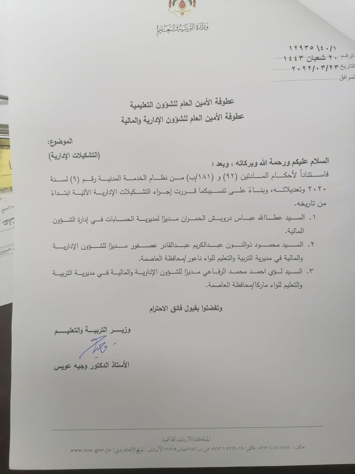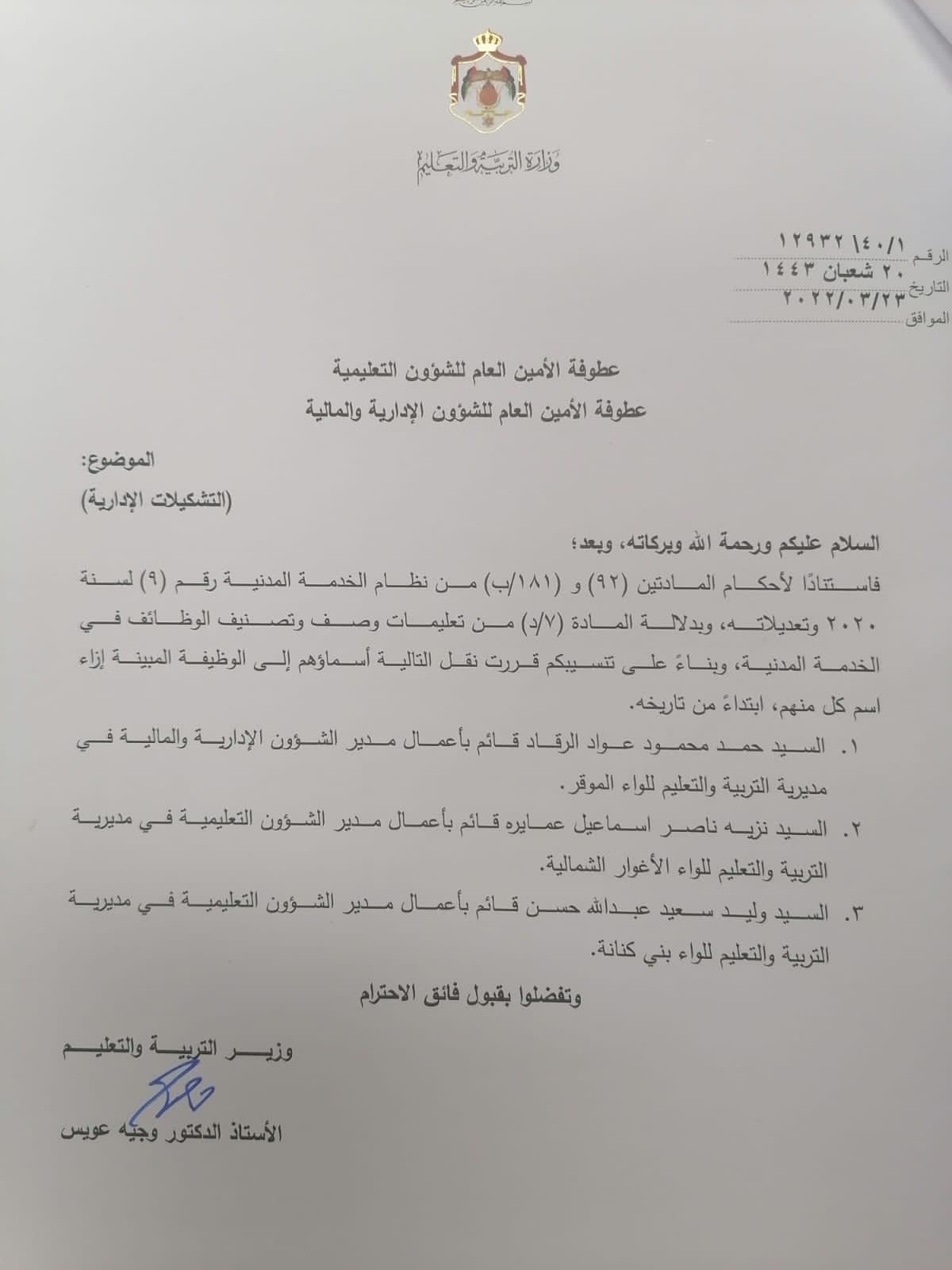 قرر وزير التربية والتعليم والتعليم العالي والبحث العلمي الدكتور وجيه عويس ، اجراء بعض التشكيلات في ادارت الوزارة ومديريات الميدان وتاليا الاسماء :-