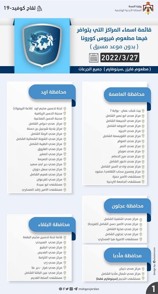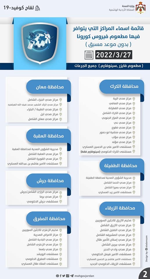 وفي منشور عبر "فيسبوك"، قالت الوزارة إن المطاعيم المتوفرة هي "فايزر" و"سينوفارم"، منوهة بأن دوام مراكز المطاعيم من الساعة 8:00 صباحًا – 3:00 مساءً.