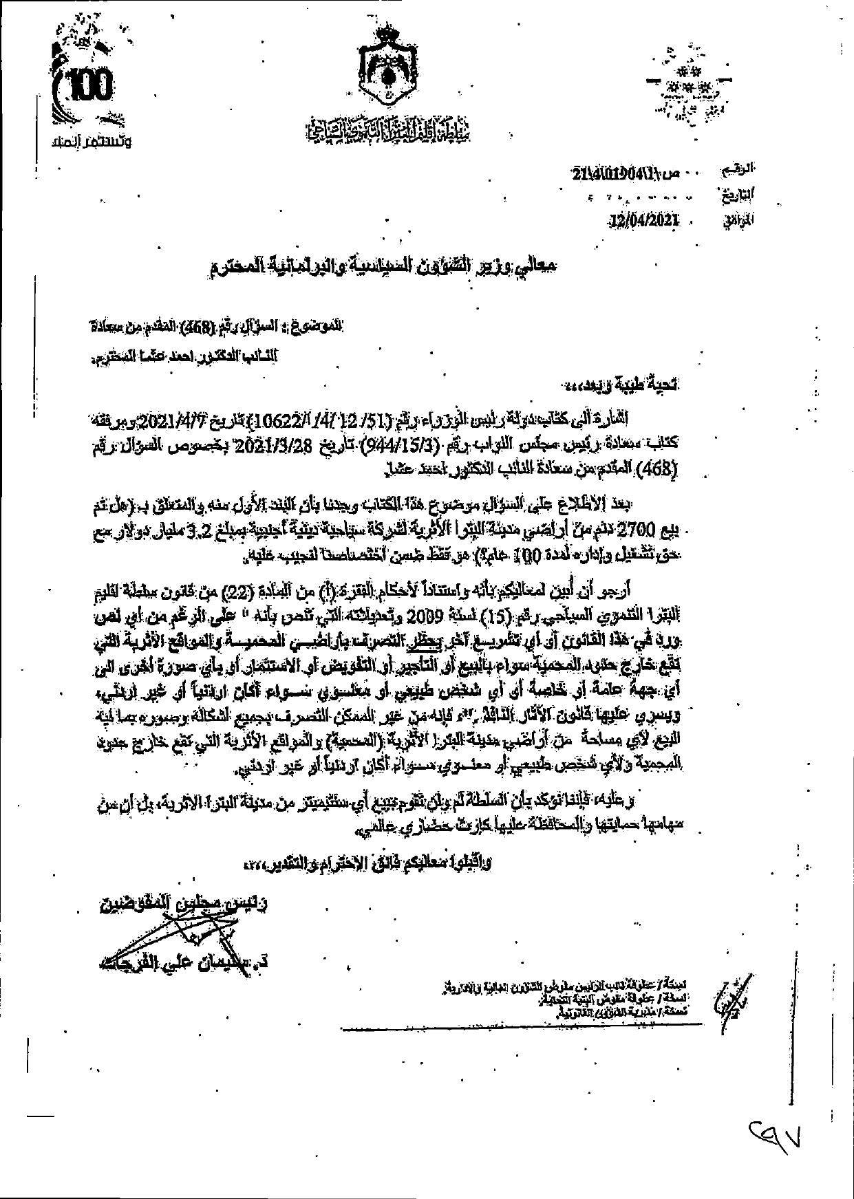 جاء رد الحكومة على سؤال نيابي من النائب الدكتور أحمد جميل عشا، تضمن استفسارات عن بيع أراض من مدينة البترا الأثرية ومطار العقبة وأراض في العقبة ومعان، إضافة إلى حق تشغيل قلعة الكرك وجبل نيبو، وامتياز التعدين في الطفيلة.