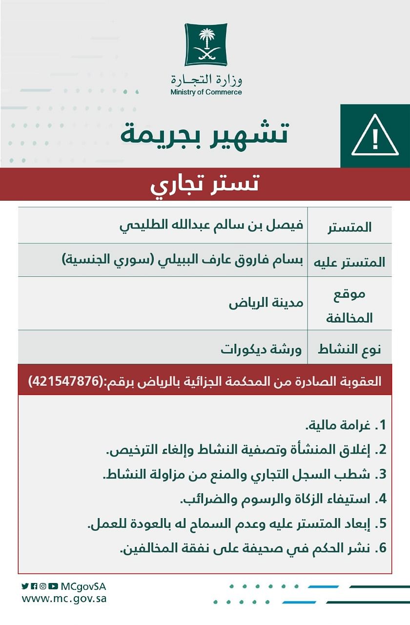 شهرت وزارة التجارة بمواطن سعودي ومقيم من جنسية سورية وذلك بعد صدور حكم قضائي يٌدينهما بارتكاب جريمة التستر التجاري.