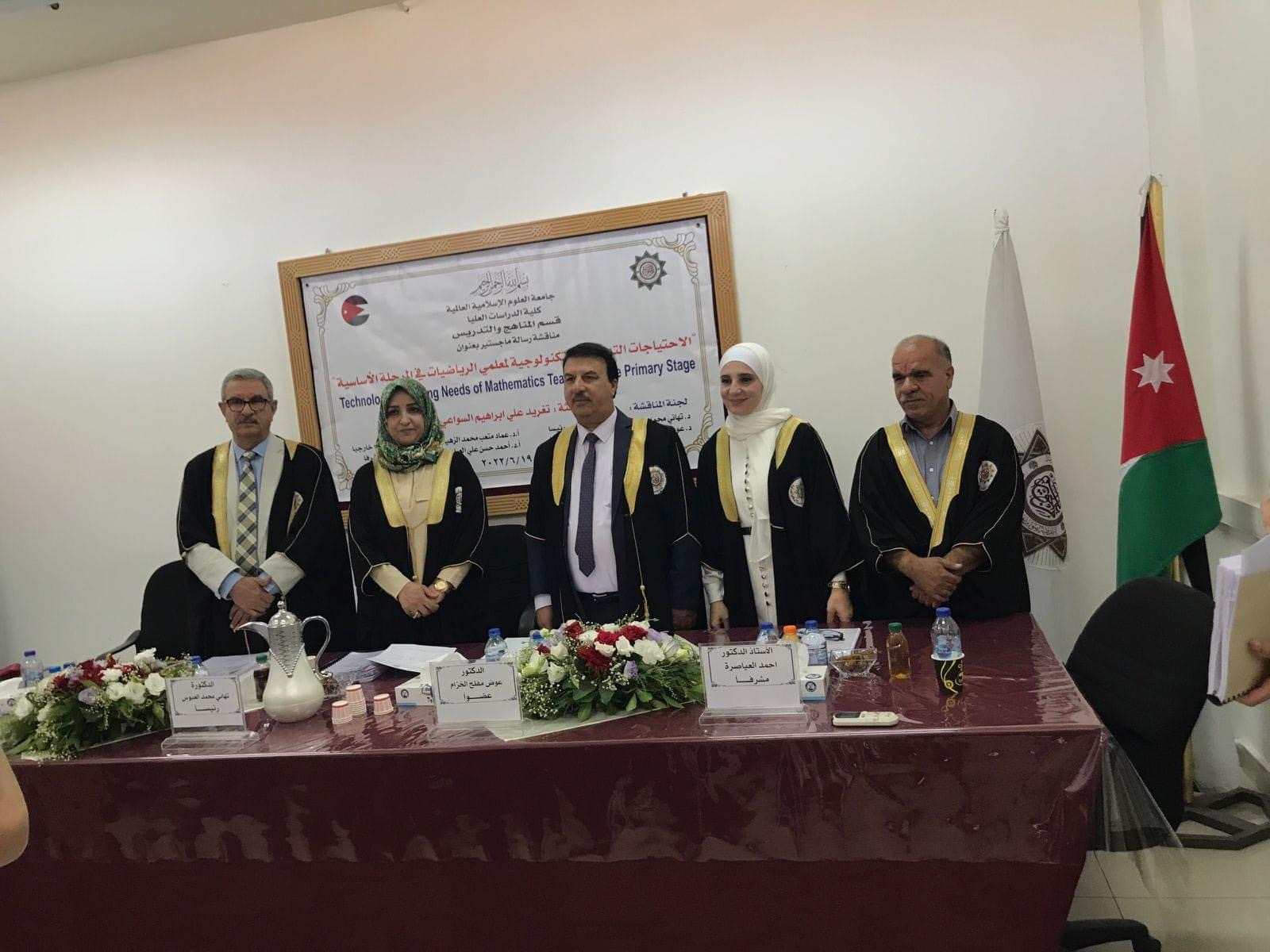 نوقشت رسالة الماجستير المقدمة من الباحثة تغريد علي ابراهيم السواعي ضمن متطلبات الحصول على درجة الماجستير بالعلوم التربوية من جامعة العلوم الاسلامية العالمية وعنوانها: (الاحتياجات التدريبية التكنولوجية لمعلمي الرياضيات في المرحلة الاساسية )وجرت المناقشة الوجاهية في قاعات الجامعة