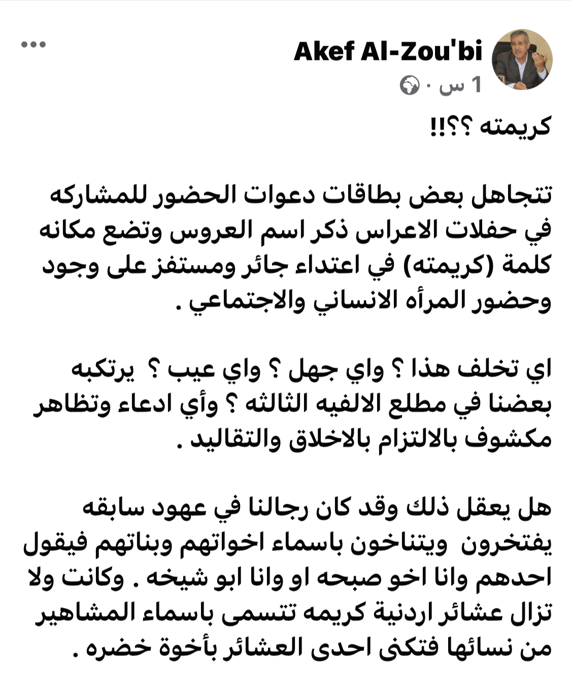 قال الوزير الاسبق العين عاكف الزعبي في ادراج له عبر الفيسبوك تحت عنوان (كريمته )