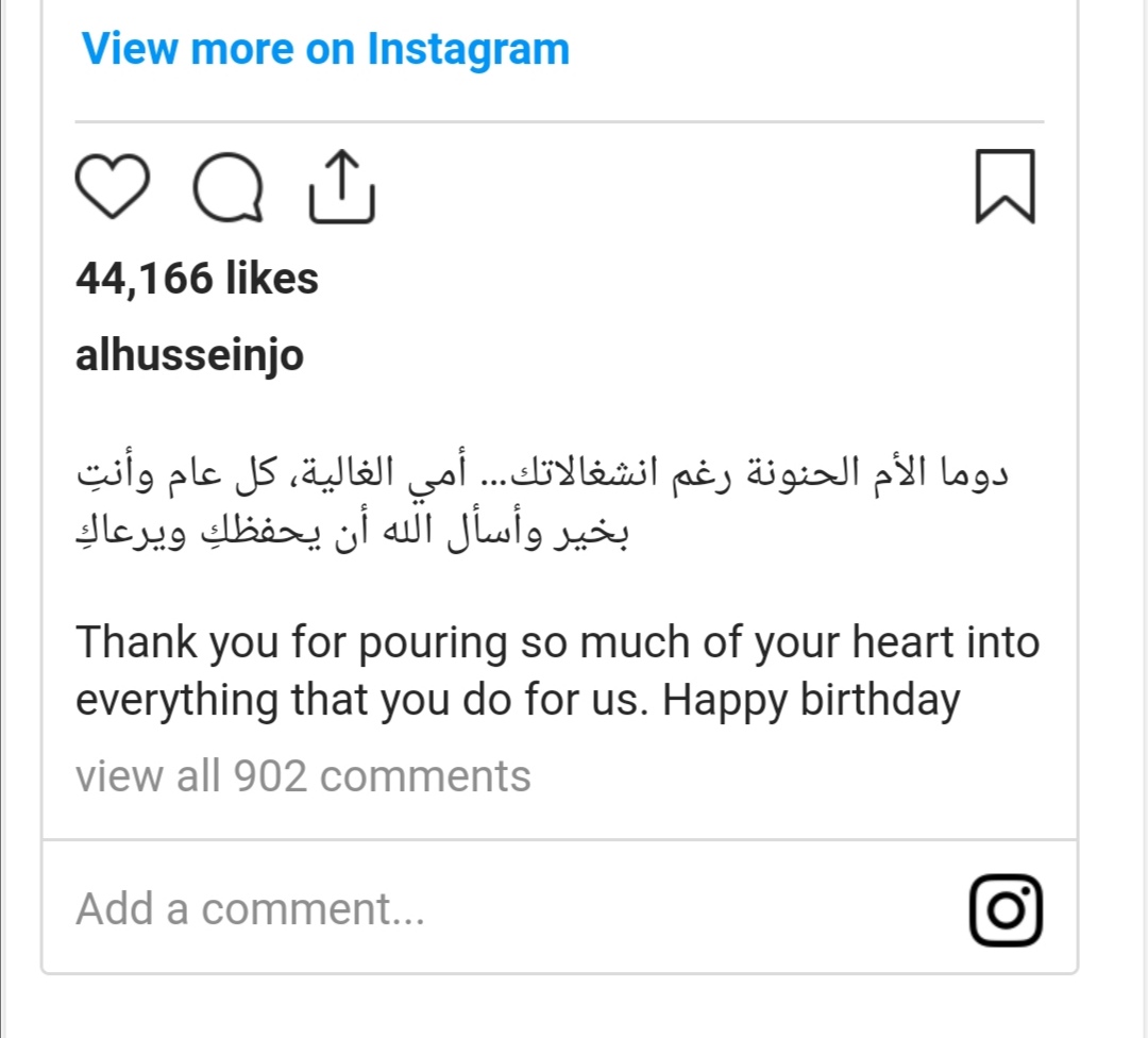 نشر ولي العهد، الأمير حسين بن عبدالله الثاني، تهنئة للملكة رانيا العبدالله بمناسية عيد ميلادها.