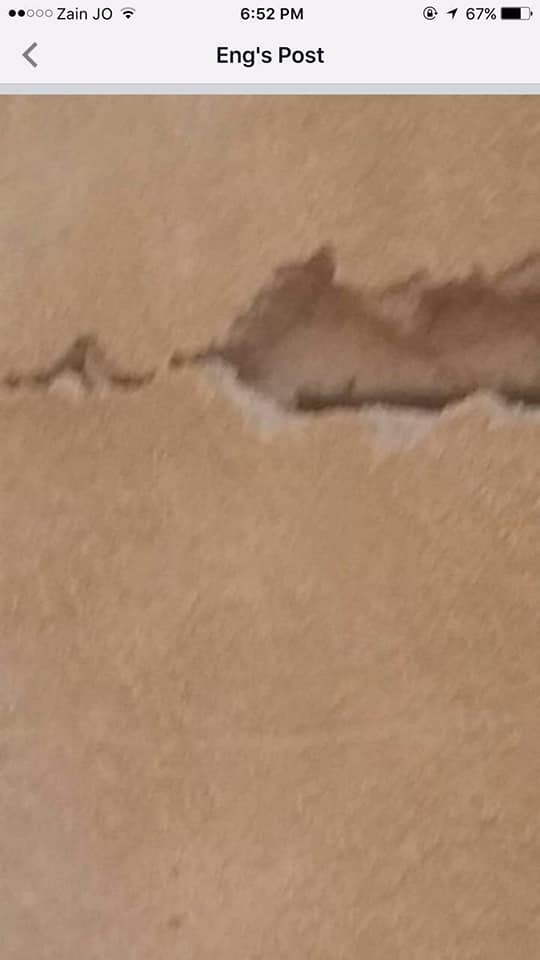 وثقت الكاتبة عروب الخوالدة عبر صفحتها في موقع فيسبوك، صورا تظهر تشققات في جدران بمشروع سكن كريم لعيش كريم في منطقة سحاب.