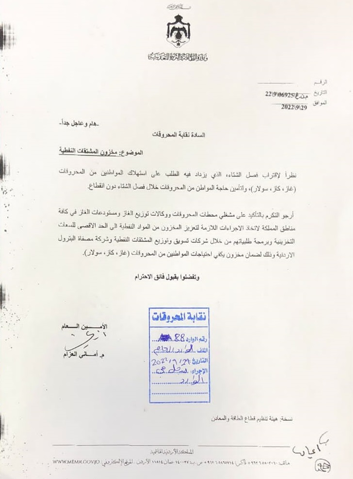 دعت وزارة الطاقة والثروة المعدنية، نقابة المحروقات، للتأكيد على مشغلي محطات المحروقات ووكالات توزيع الغاز ومستودعات الغاز في كافة مناطق المملكة لاتخاذ الإجراءات اللازمة لتعزيز المحزون من المواد النفطية الى الحد الاقصى للسعات التخزينية.