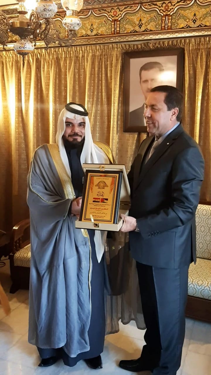 وقام رئيس الوفد بتقديم درع تذكاري باسم الرابطة تكريما وتقديرا للجمهورية العربية السورية قائدا وجيشا وحكومة وشعب تقديرا لمواقفهم القومية والقضاء على الارهاب .