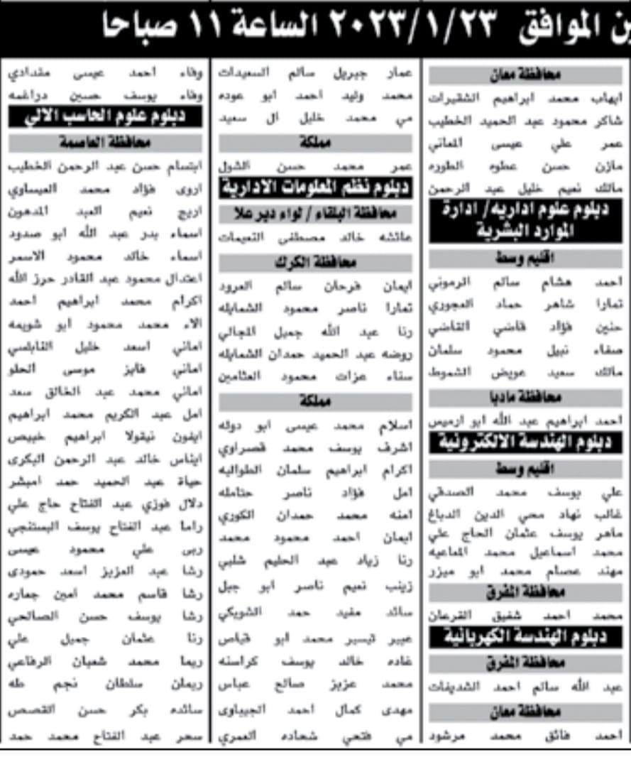 دعا ديوان الخدمة المدنية بالتنسيق مع وزارة الاوقاف والشؤون والمقدسات الإسلامية؛ وزارة العدل، وزارة النقل؛ وزارة الداخلية، وزارة الصحة، وزارة الزراعة؛ وزارة الثقافة؛ وزارة التنمية الاجتماعية، وزارة الاشغال العامة والاسكان، هيئة تنظيم قطاع الطاقة والمعادن؛ هيئة اعتماد التعليم العالي، هيئة تنظيم قطاع النقل البري، مؤسسة تنمية أموال الايتام، مؤسسة التدريب المهني، مؤسسة استثمار الموارد الوطنية وتنميتها، مستشفى الملك المؤسس، مستشفى الجامعة الأردنية، صندوق المعونة الوطنية؛ صندوق الحح؛ صندوق التنمية والتشغيل؛ سلطة المياه؛ سلطة إقليم البترا التنموي والسياحي؛ سلطة وادي الاردن، دائرة قاضي القضاة، دائرة الاحوال المدنية والجوازات، دائرة الشؤون الفلسطينية؛ دائرة المكتبة الوطنية؛ دائرة الأراضي والمساحة، الجامعة الأردنية؛ جامعة ال البيت، جامعة اليرموك، جامعة البلقاء التطبيقية؛ بنك تنمية المدن والقرى، المؤسسة العامة للغذاء والدواء ؛ المؤسسة الاستهلاكية المدنية، المركز الجغرافي الملكي الأردني؛ وزارة الإدارة المحلية (بلدية طبقة فحل؛ بلدية رابية الكورة؛ بلدية بني هاشم، بلدية ام الرصاص، بلدية الوسطية؛ بلدية الرمثا الجديدة)؛ المرشحين التالية أسماؤهم، التواجد في مبنى ديوان الخدمة المدنية؛ لحضور الامتحان التنافسي الإلكتروني حسب الايام والأوقات المحددة ادناه وفقا للمجالات التالية: