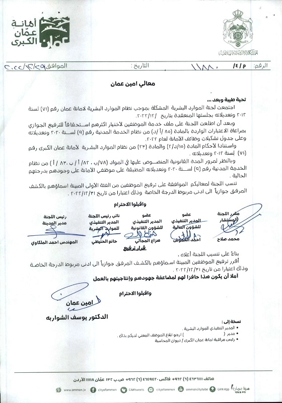 وافق امين عمان يوسف الشواربة على اجراء ترفيعات في بعض المديريات و الأقسام في الأمانة وعلى النحو التالي.