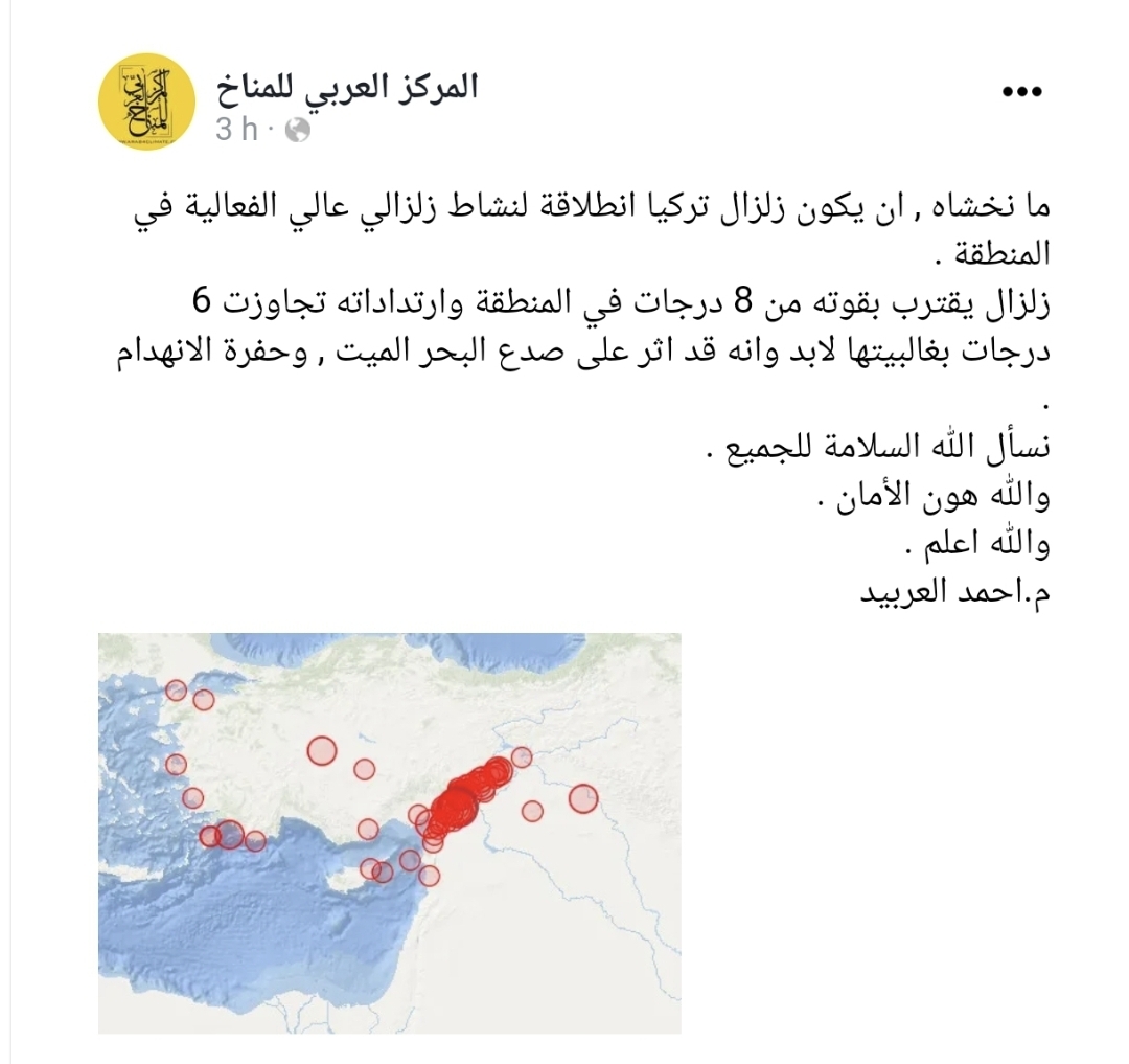 قال المركز العربي للمناخ إن “هناك مخاوف من أن يكون زلزال تركيا انطلاقة لنشاط زلزالي عالي الفعالية في المنطقة”.