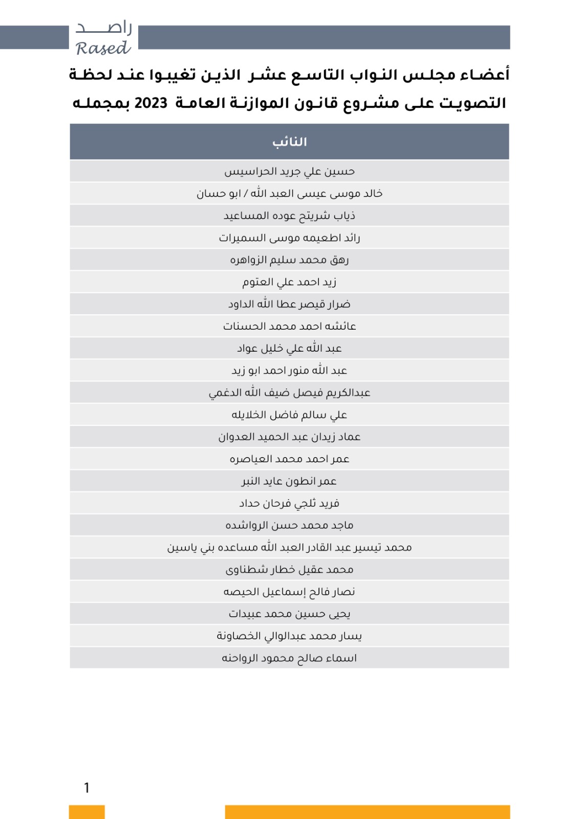 :ضمن إطار مراقبة مناقشات مجلس النواب لمشروع قانون الموازنة 2023، عمل فريق "راصد” لمراقبة البرلمان على متابعة أداء اللجنة المالية أثناء مناقشتها لمشروع القانون وتحليل مناقشات وخطابات البرلمانيين والبرلمانيات وتتبع السلوك التصويتي للبرلمانيين والبرلمانيات على قانون الموازنة لعام 2023، حيث تم إقرار القانون بمجمله بما نسبته 75٪ من مجمل النواب الحضور عند لحظة التصويت وتغيب 23 نائباً عند لحظة التصويت، ويشيد راصد بشفافية التصويت على الموازنة والذي يسهل على القواعد الانتخابية معرفة توجهات وسلوك ممثليهم داخل مجلس النواب، كما يعطي مساحة كافية لوسائل الإعلام من التعرف على السلوك التصويتي للنواب، وفي ذات السياق يشددّ راصد على أهمية وضرورة تواجد النواب لتمثيل قواعدهم خلال التصويت على مشاريع القوانين وخصوصاً الموازنة، وتحدث خلال جلسات مناقشة مشروع القانون 90 برلمانية وبرلمانياً والتي امتدت على مدار 3 أيام عمل صباحياً ومسائياً.