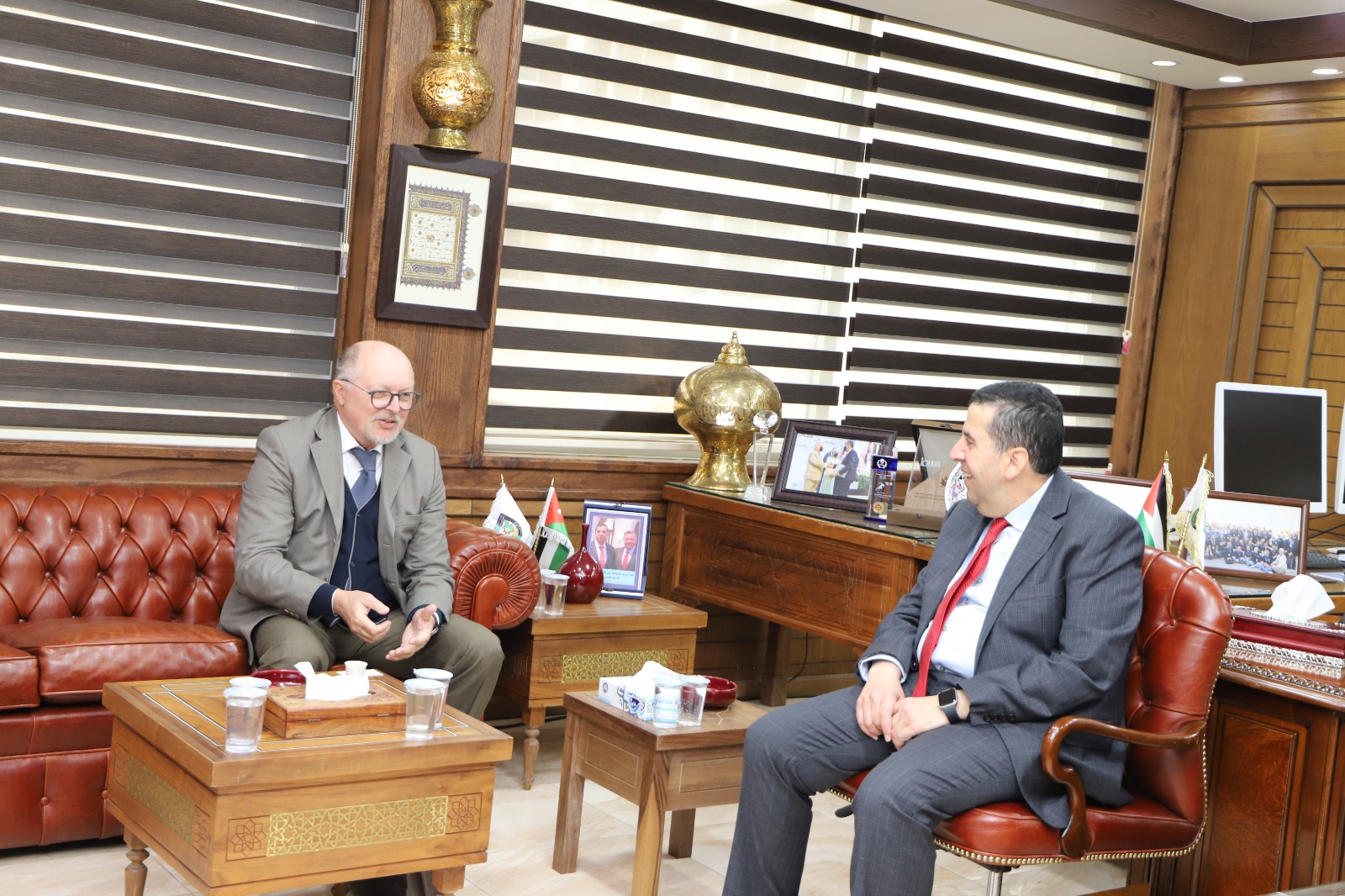 استقبل رئيس جامعة البلقاء التطبيقية الأستاذ الدكتور أحمد فخري العجلوني في مكتبه الدكتور ولفغانغ فروبيرغ من الوكالة الالمانية للتعاون الدولي GIZ مسؤول مكون التعليم العالي في مشروع برامج التعليم التقني والمهني الموجه نحو سوق العمل في الوكالة.