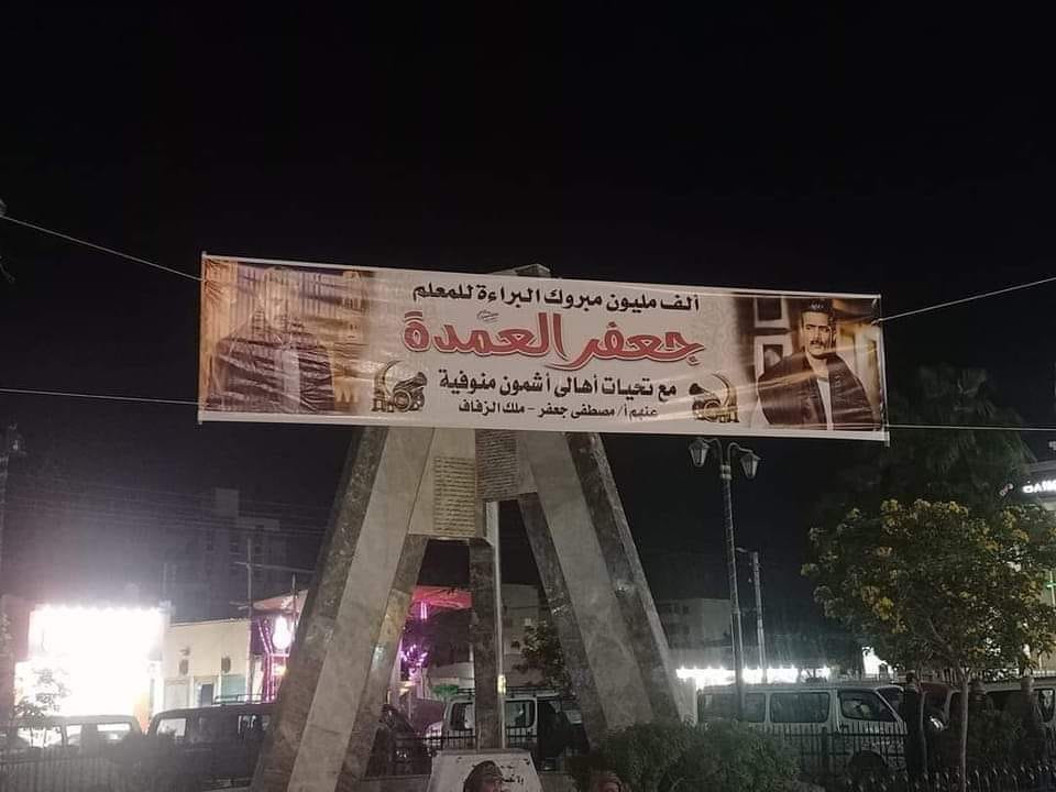 وقام أهالي مركز أشمون التابع لمحافظة المنوفية، بتوزيع الشربات على العابرين في الطرقات، وذلك فرحا بخروج جعفر العمدة من مركز الشرطة، حيث كتبوا عليها "ألف مليون مبروك البراءة للمعلم جعفر العمدة".