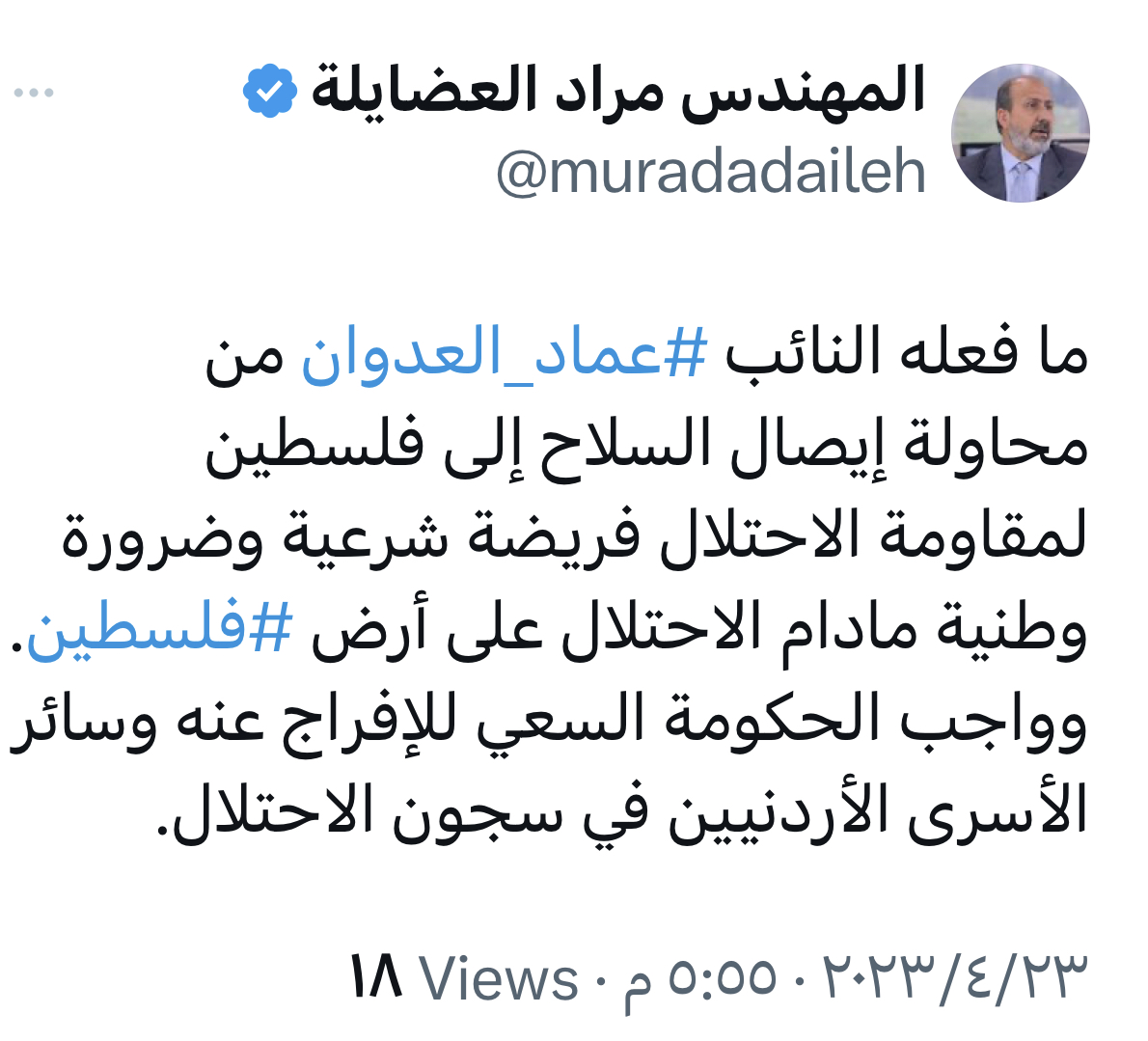ما فعله النائب #عماد_العدوان من محاولة إيصال السلاح إلى فلسطين لمقاومة الاحتلال فريضة شرعية وضرورة وطنية مادام الاحتلال على أرض #فلسطين.