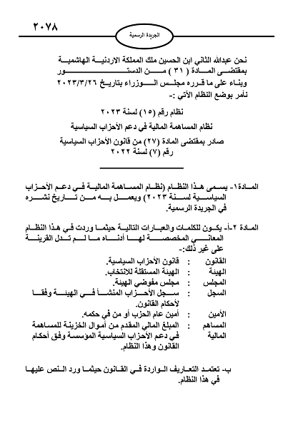 صدرت الإرادة الملكية السامية، بالموافقة على قرار مجلس الوزراء، المتضمن إقرار نظام المساهمة المالية في دعم الأحزاب السياسية .