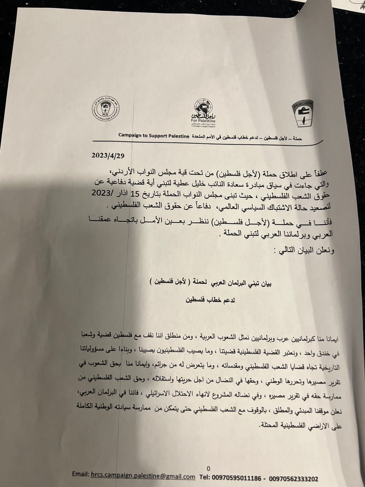 وتالياً نص البيان : عطفاً على اطلاق حملة (لأجل فلسطين) من تحت قبة مجلس النواب الأردني، والتي جاءت في سياق مبادرة سعادة النائب خليل عطية لتبني أية قضية دفاعية عن حقوق الشعب الفلسطيني ، حيث تبنى مجلس النواب الحملة بتاريخ 15 اذار /2023 لتصعيد حالة الاشتباك السياسي العالمي، دفاعاً عن حقوق الشعب الفلسطيني .