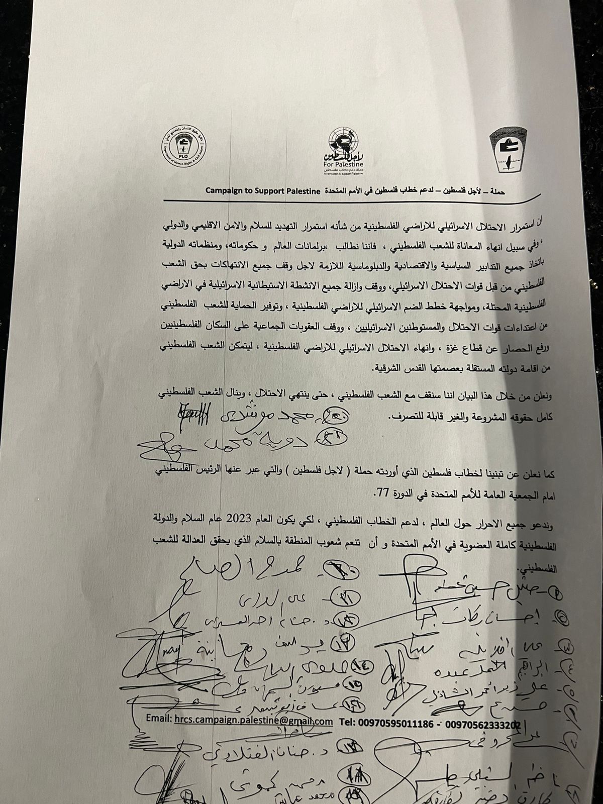 كما نعلن عن تبنينا لخطاب فلسطين الذي أوردته حملة ( لاجل فلسطين ) والتي عبر عنها الرئيس الفلسطيني امام الجمعية العامة للأمم المتحدة في الدورة 77.