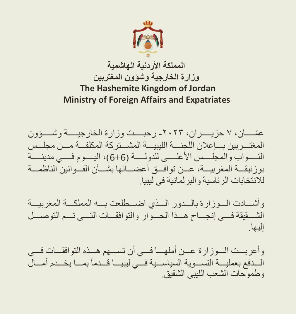 رحبت وزارة الخارجية وشؤون المغتربين بإعلان اللجنة الليبية المشتركة المكلفة من مجلس النواب والمجلس الأعلى للدولة (6+6)، اليوم الأربعاء، في مدينة بوزنيقة المغربية، عن توافق أعضائها بشأن القوانين الناظمة للانتخابات الرئاسية والبرلمانية في ليبيا.