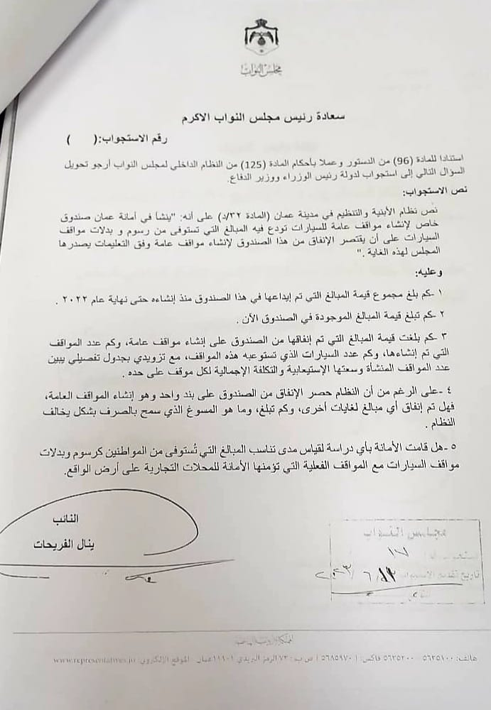 أحال النائب ينال فريحات السؤال الذي وجهه إلى أمانة عمان حول الصندوق الخاص لإنشاء مواقف عامة للسيارات إلى استجواب بسبب تجاوز الأمانة للمدة القانونية المخصصة للإجابة والبالغة شهراً.