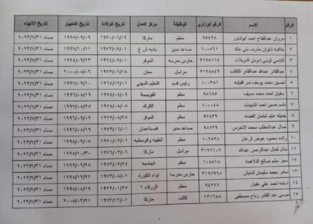 قررت وزارة التربية والتعليم إنهاء خدمات المذكورين في الكشف المرفق بناء على طلبهم اعتبارا من التاريخ المبين إزاء اسم كل منهم، حيث إنهم استكملوا شروط الحصول على التقاعد المبكر من حيث العمر وعدد الاشتراكات
