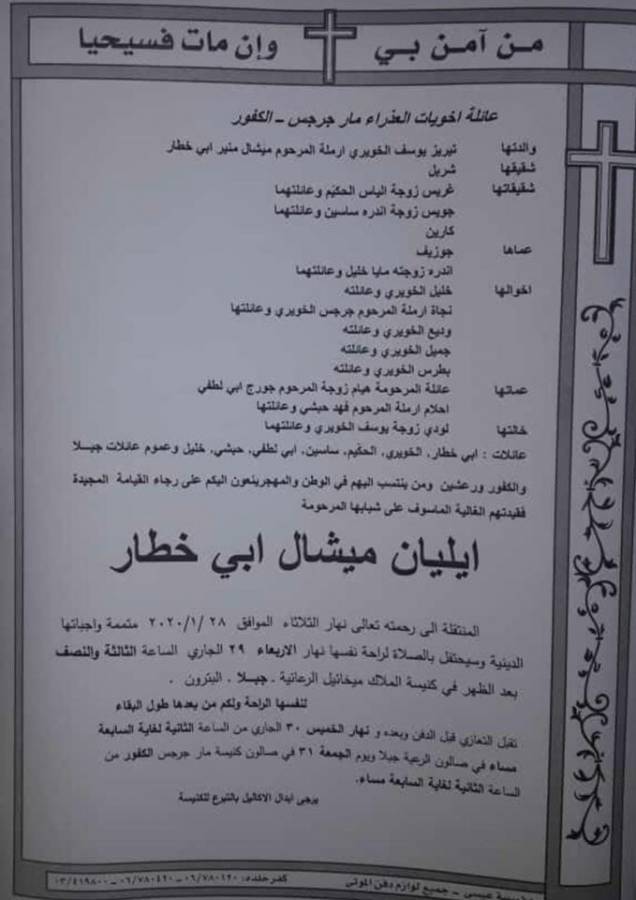 "عُرف عن إليان إيمانها، حيث كرّست سنواتها القليلة في الحياة من أجل الكنسية، فهي الرئيسة السابقة لأخوية فرسان العذراء – الكفور، كما عُرفت بنشاطها الكشفي، إضافة الى ذلك كانت تمتلك محل esthétique"، قال صديق العائلة آلان كرم، قبل أن يضيف: "خسارتنا كبيرة لصغيرة عائلتها وتوأم شقيقها، التي التحقت بوالدها المرحوم ميشال"، لافتاً إلى أنها "عروس السماء التي ستبقى في قلبنا حتى معاودة اللقاء".