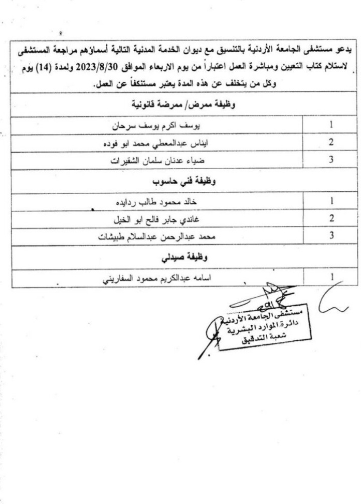 وقال المستشفى، إنه على التالية أسماؤهم مراجعة المستشفى لاستلام كتاب التعيين ومباشرة العمل ابتداء من الأربعاء الموافق 2023/8/30، ولمدة (14) يوما.