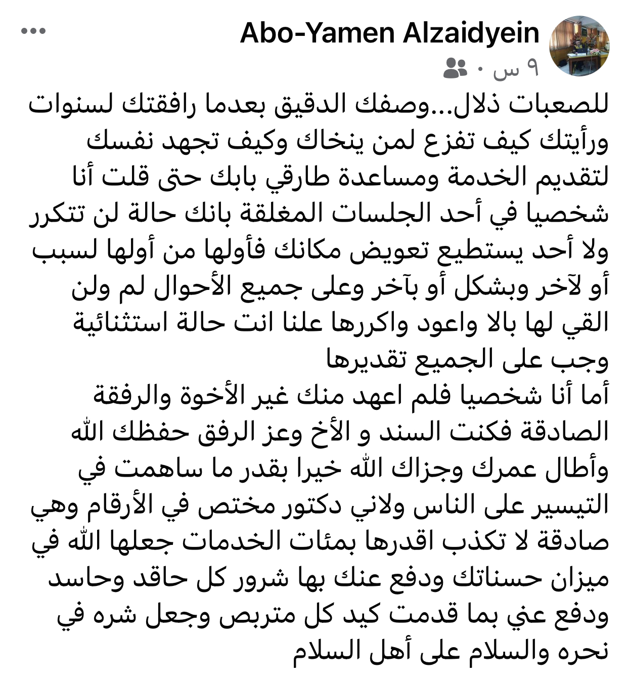 للصعبات ذلال…وصفك الدقيق بعدما رافقتك لسنوات ورأيتك كيف تفزع لمن ينخاك وكيف تجهد نفسك لتقديم الخدمة ومساعدة طارقي بابك حتى قلت أنا شخصيا في أحد الجلسات المغلقة بانك حالة لن تتكرر ولا أحد يستطيع تعويض مكانك فأولها من أولها لسبب أو لآخر وبشكل أو بآخر وعلى جميع الأحوال لم ولن القي لها بالا واعود واكررها علنا انت حالة استثنائية وجب على الجميع تقديرها
