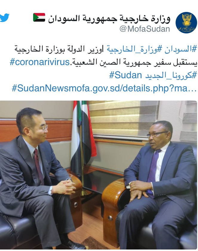 وتم العثور لاحقًا على الصورة عينها منشورة في الثالث من شباط/ فبراير 2020 على الصفحة الرسمية لوزارة الخارجية السودانية عبر موقع تويتر مرفقة بالتعليق "وزير الدولة بوزارة الخارجية يستقبل سفير جمهورية الصين الشعبية".