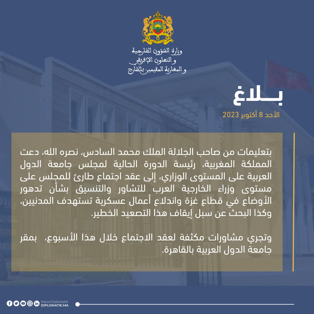 المغرب يَدعو إلى عَقد اجتماع طارئ لمجلس الجامعة العربية على مستوى وزراء الخارجية للتشاور بشأن تدهور الأوضاع في قطاع غزة
