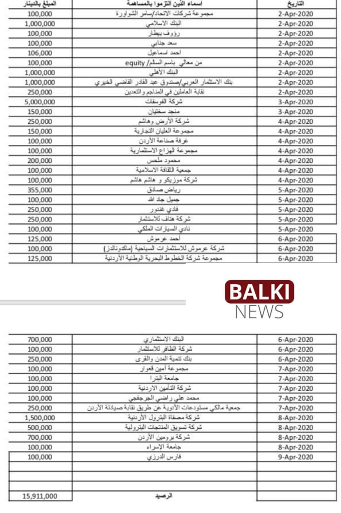 في المرفق، أن هيئات وذوات ومؤسسات وبنوك قدموا للأردن ما هم اهل له، في لحظة حرجة من تاريخه، فهذا زمن التعبير الحقيقي عن الانتماء للوطن، هذا زمن الهمم الكبيرة وزمن المواجهة للتحديات، وزمن التشمير عن السواعد التي تعرف أرضها وقمحها.