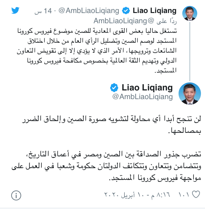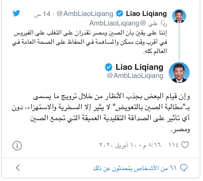اعتبر السفير الصيني لدى مصر، لياو ليتشيانغ، مطالبة "بضعة أشخاص في مصر" بكين بدفع تعويضات عن أضرار فيروس كورونا المستجد، باطلة، وقال إنها "لا تثير إلا السخرية والاستهزاء"وذكر في تغريدة على حسابه في "تويتر": "أن قيام البعض بجذب الأنظار من خلال الترويج لما يسمى بمطالبة الصين بالتعويض لا تثير إلا السخرية والاستهزاء،