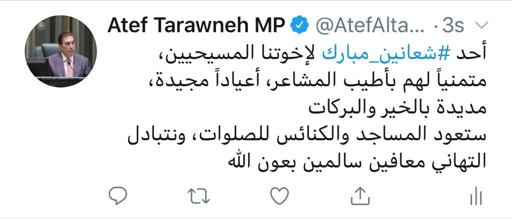 وكتب الطراونة في تغريدة له عبر تويتر: أحد شعانين مبارك لإخوتنا المسيحيين، متمنياً لهم بأطيب المشاعر، أعياداً مجيدة، مديدة بالخير والبركات.