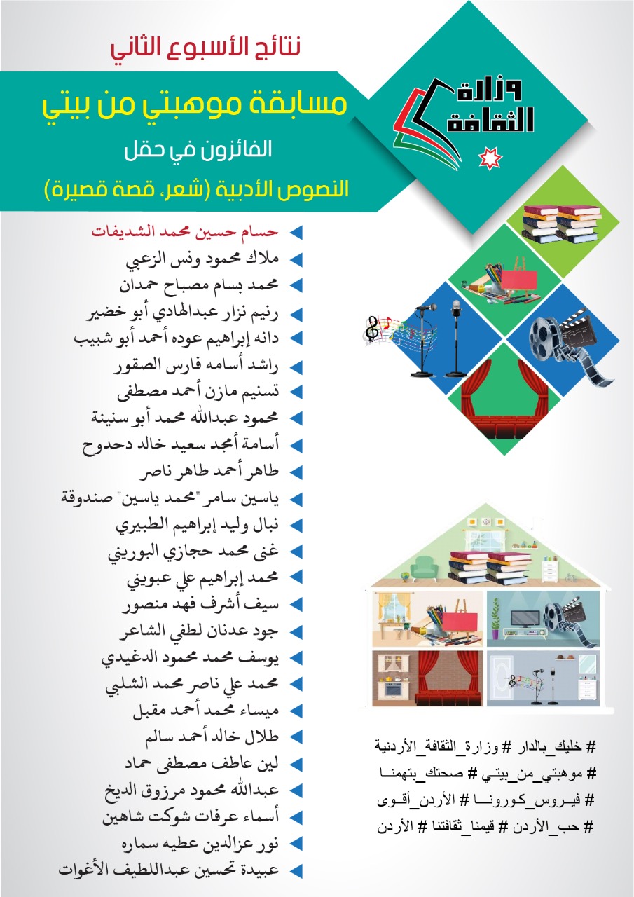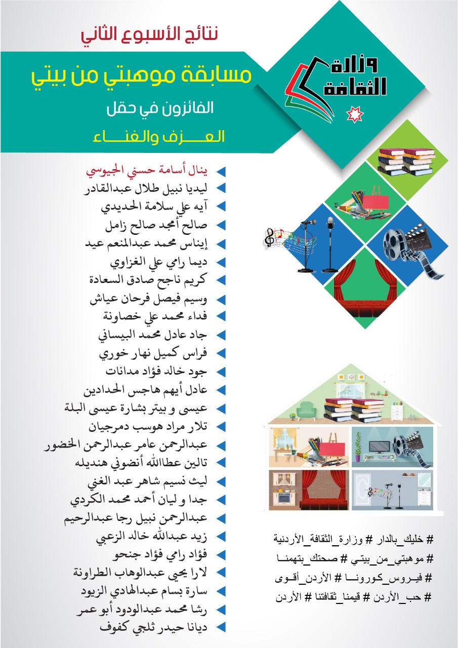 أعلنت وزارة الثقافة أسماء الفائزين في مسابقة "موهبتي من بيتي"للأسبوع الثاني التي أطلقتها الوزارة مؤخرا على موقعها الإلكتروني وشبكات التواصل الاجتماعي. وسط اقبال واسع على المشاركة والتفاعل حيث زادت اعداد المشاركات في الاسبوع الثاني نحو 95 % على اعداد المشاركات في الاسبوع الاول في مختلف حقول المسابقة ومن مختلف المحافظات .