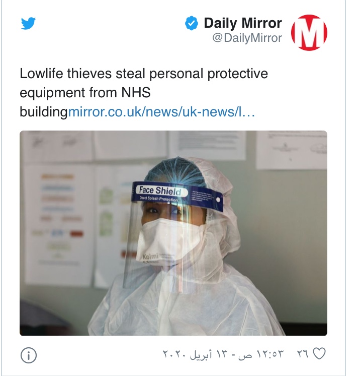 وقالت متحدثة باسم مؤسسة سالفورد رويال التابعة لدائرة الصحة في إنجلترا: "لقد صدمنا بشدة بسبب تعرض المؤسسة للسرقة والسطو على معدات الوقاية الشخصية" في هذا الوقت العصيب.