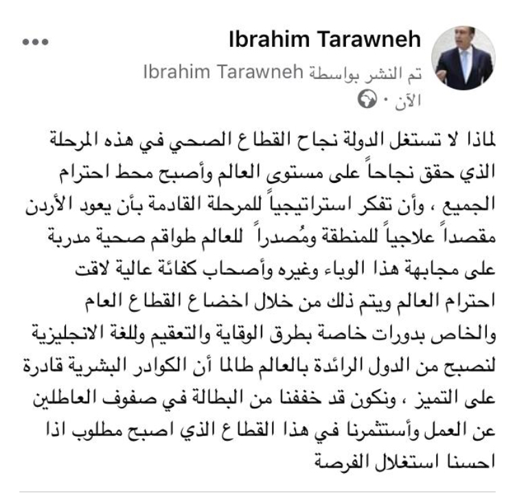 لماذا لا تستغل الدولة نجاح القطاع الصحي في هذه المرحلة الذي حقق نجاحاً على مستوى العالم وأصبح محط احترام الجميع ، وأن تفكر استراتيجياً للمرحلة القادمة بأن يعود الأردن مقصداً علاجياً للمنطقة ومُصدراً للعالم طواقم صحية مدربة على مجابهة هذا الوباء وغيره وأصحاب كفائة عالية لاقت احترام العالم ويتم ذلك من خلال اخضاع القطاع العام والخاص بدورات خاصة بطرق الوقاية والتعقيم وللغة الانجليزية لنصبح من الدول الرائدة بالعالم طالما أن الكوادر البشرية قادرة على التميز ، ونكون قد خففنا من البطالة في صفوف العاطلين عن العمل وأستثمرنا في هذا القطاع الذي اصبح مطلوب اذا احسنا استغلال الفرصة