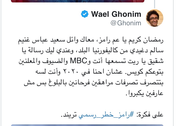 وجه الناشط المصري وائل غنيم، رسالة لمواطنه، الممثل ومقدم البرامج رامز جلال، امس السبت، بعد الحلقة الثانية من برنامج الأخير الجديد "رامز مجنون رسمي"، تضمنت انتقادا للبرنامج وإيضاحا لما يتركه من أثر على عقول الأطفال حسبما يرى غنيم.