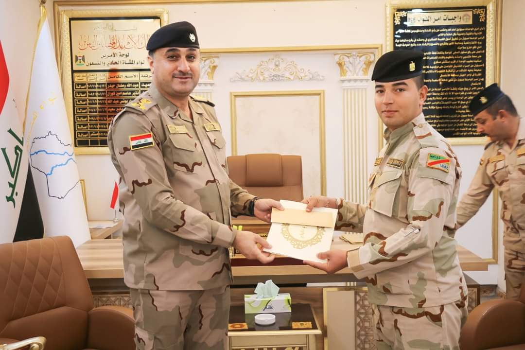 كرم آمر اللواء المشاة الحادي والتسعين/ الفرقة المشاة الحادية والعشرين في الجيش العراقي ، عدداً من المقاتلين المنسوبين الى الفوج الثاني للواء أعلاه، لإخلاصهم في عملهم، بكتاب شكر وتقدير لهم فضلاً عن الدعم المادي . وفي الختام شكر المقاتلون آمر اللواء لرفعه روحهم المعنوية ومتابعته المستمرة لهم. الى ذلك كرم آمر الفوج الثاني/ اللواء المشاة الرابع والأربعين/ الفرقة المشاة الحادية عشرة عدداً من المراتب لجهودهم المبذولة في المهام والواجبات الموكلة إليهم وجاء هذا التكريم ليكون حافزاً لبقية المقاتلين..
