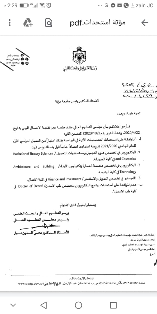 وافق مجلس التعليم العالي ،في جلستة التي عقدها عبر تقنية الاتصال المرئي ،بالموافقة على استحداث التخصصات التالية في جامعة مؤتة ،وذلك اعتبارا من الفصل الدراسي الاول للعام الجامعي 2020/2021 .