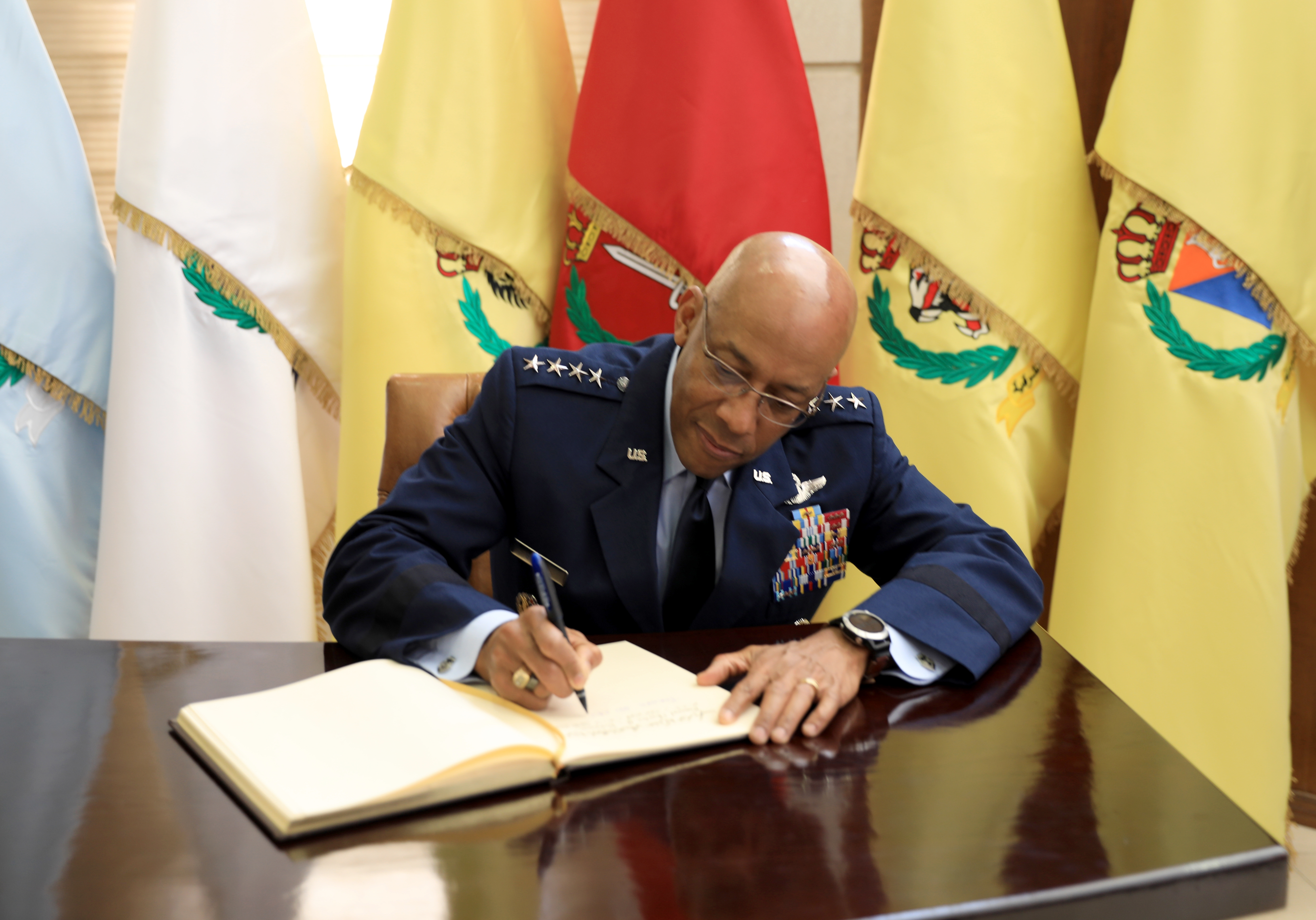 استقبل رئيس هيئة الأركان المشتركة اللواء الركن يوسف أحمد الحنيطي، اليوم الثلاثاء، في مكتبه بالقيادة العامة رئيس هيئة الأركان المشتركة الأمريكية الفريق أول تشارلز براون والوفد المرافق.وبحث اللواء الركن الحنيطي مع نظيره الأمريكي، بحضور السفيرة والملحق الدفاعي الأمريكي في عمّان، مجالات التعاون العسكري بين الجيشين، وعدد من الموضوعات ذات الاهتمام المشترك، إضافةً إلى آخر التطورات على الساحتين الإقليمية والدولية بما يخدم مصلحة القوات المسلحة في البلدين الصديقين.واستمع رئيس هيئة الأركان المشتركة والوفد الضيف إلى عدد من الإيجازات العسكرية التي تبين حجم التطوير والتحديث على الأسلحة والمهام والمعدات في القوات المسلحة الأردنية، وبما ينسجم مع طبيعة التطورات التي تشهدها المنطقة على مختلف الأصعدة.ودوّن رئيس هيئة الأركان المشتركة الأمريكي كلمة في سجل الزوار.