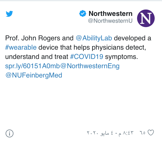 وقال جون روجرز، المهندس في نورث وسترن وقائد فريق تطوير التكنولوجيا: "تشير أحدث الدراسات المنشورة في مجلة الجمعية الطبية الأمريكية إلى أن أولى علامات الإصابة بـ COVID-19 هي الحمى والسعال وصعوبة التنفس، يوضع جهازنا في الموقع المثالي على الجسم، لقياس معدل التنفس والأصوات والنشاط لأن هذا هو المكان الذي يحدث فيه تدفق الهواء بالقرب من سطح الجلد".