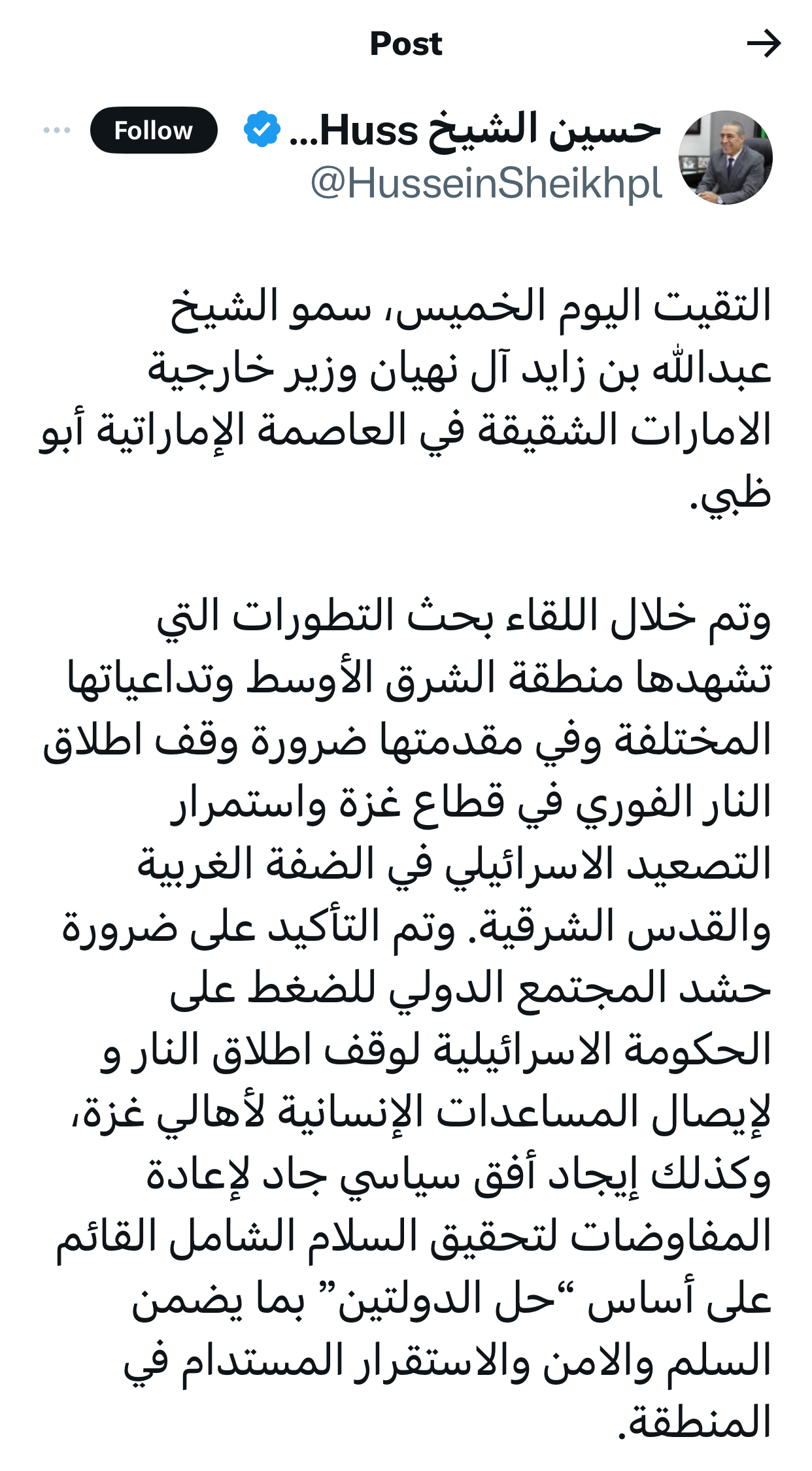كما أكد خلال لقائه حسين الشيخ على نهج دولة الإمارات الثابت في دعم الشعب الفلسطيني الشقيق وحرصها على العمل مع كافة الأطراف الفاعلة في المجتمع الدولي لإنهاء الأزمة الإنسانية التي يعاني منها أهالي غزة والضفة الغربية والقدس.