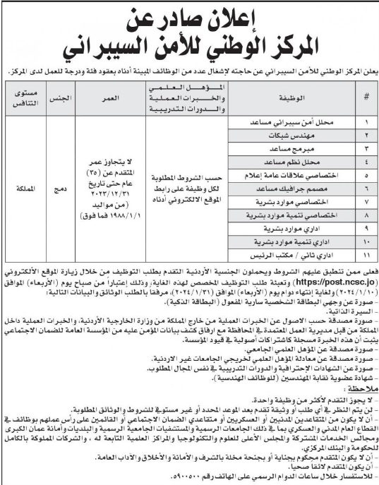 أعلن المركز الوطني للأمن السيبراني عن حاجته لإشغال عدد من الوظائف المبينة أدناه بعقود فئة ودرجة للعمل لدى المركز.