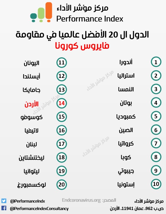 حل الأردن بالمرتبة ال 14 عالميا في مقاومة فايروس كورونا المستجد. امارة أندورا احتلت الترتيب الأول بينما قبعت الولايات المتحدة الامريكية بالمركز الأخير، وفق ما رصده مركز مؤشر الأداء عن منظمة Endcoronavirus.org ومقرها الولايات المتحدة الامريكية.