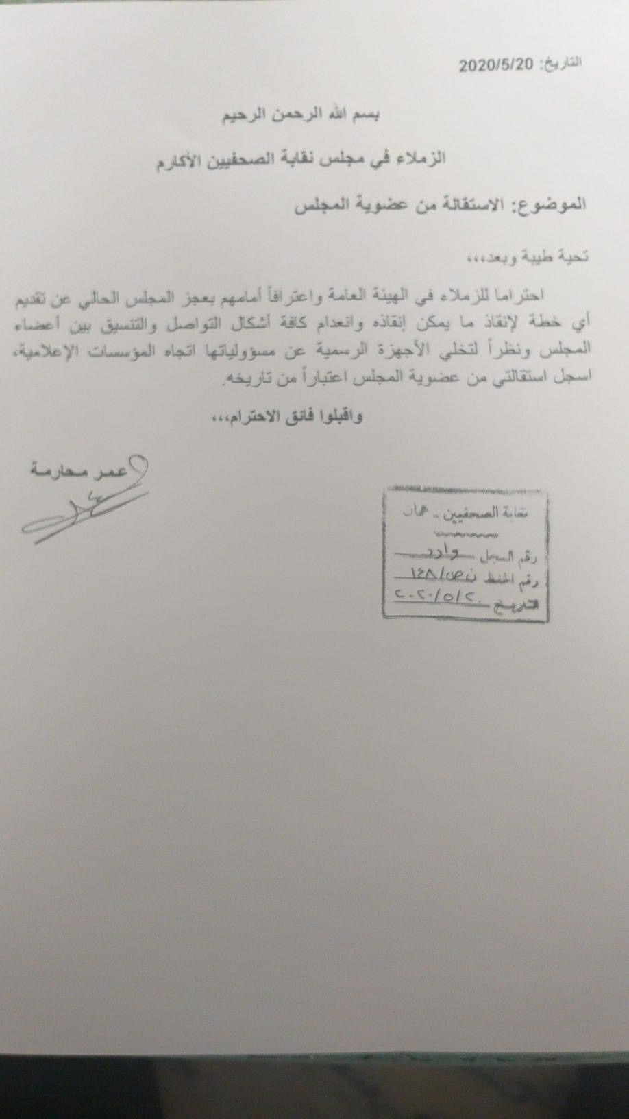 المحارمة يقدم استقالته من عضوية مجلس نقابة الصحفيين