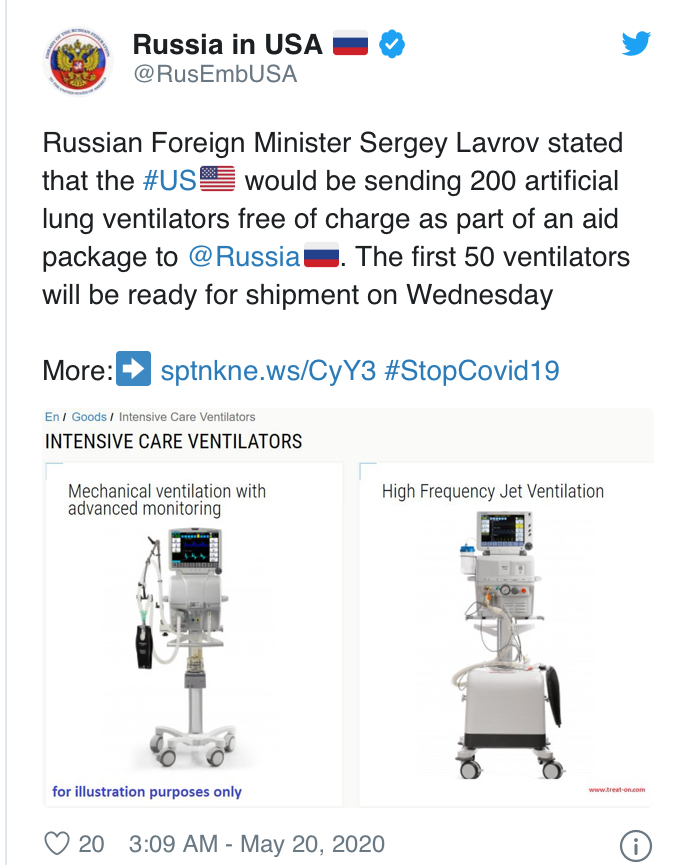 فقد بعثت روسيا بشحنة أجهزة تنفس صناعي روسية للولايات المتحدة لكن مسؤولين أمريكيين قالوا إنها لم تكن مطلوبة.وتسلطت الأضواء على جهاز التنفسالاصطناعي الروسي (أفانتا-إم) بعدما تردد أنه تسبب في حرائق بمستشفيات بموسكو وسان بطرسبرج وأودى بحياة العديد من الأشخاص. ودفع ذلك روسيا لتعليق استخدام أجهزة أفانتا-إم التي تم إنتاجها بعد الأول من أبريل نيسان.ووفقا لوسائل إعلام أمريكية وروسية لم يتم استخدامها بعد وستعاد قريبا إلى روسيا.