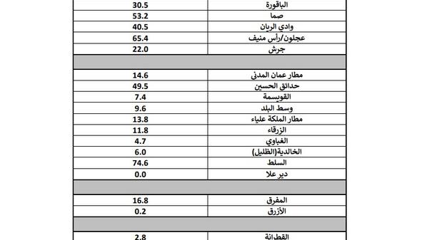 وبحسب الكشف الصادر عن دائرة الأرصاد الجوية لم تسجل محافظة العقبة والجفرر والبتراء ومعان اي كميات تذكر . وتالياً كميات الأمطار الهاطلة على المملكة خلال الـ 48 ساعة الماضية .