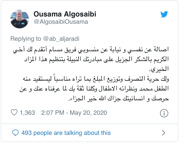 وكان الجرادي أعلن المزاد في تغريدة أرفقها بصور الطفل جاء فيها: