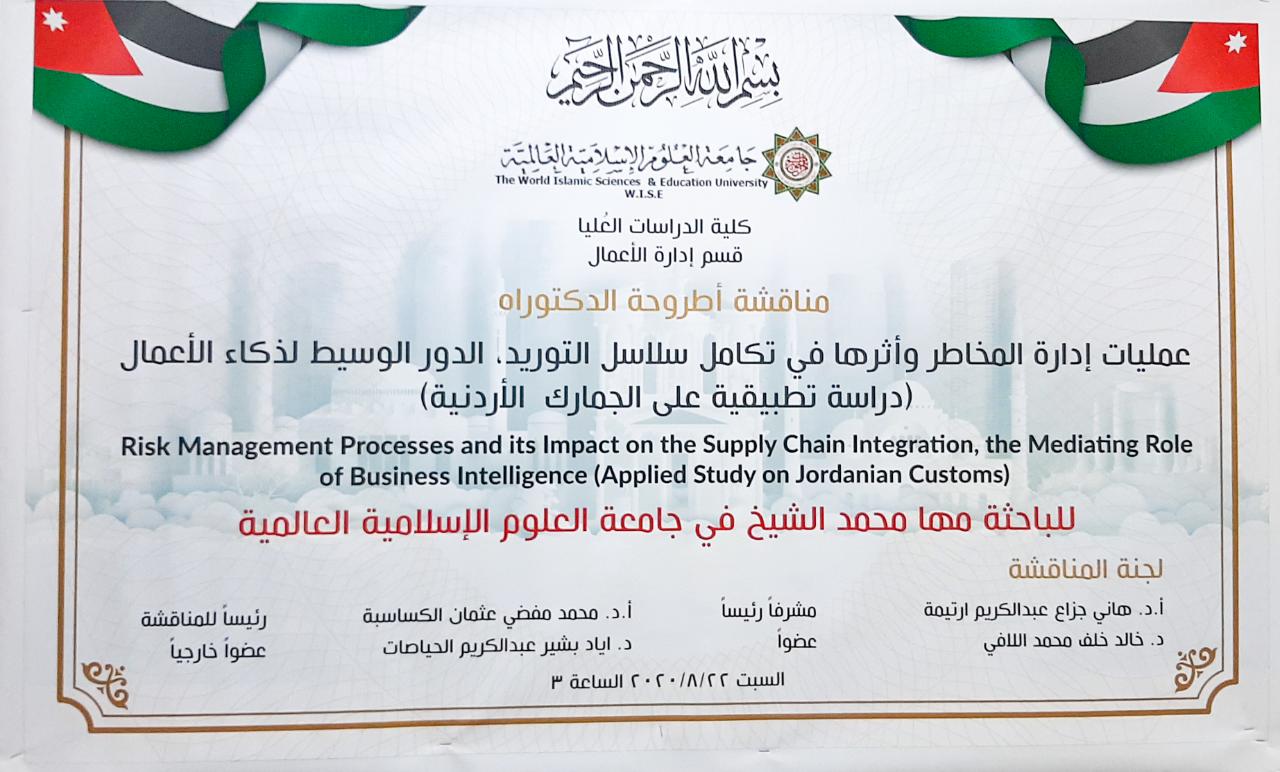نوقشت في جامعة العلوم الإسلامية، أطروحة دكتوراة الأولى من نوعها في علم سلاسل التوريد ، للباحثة مها الشيخ.